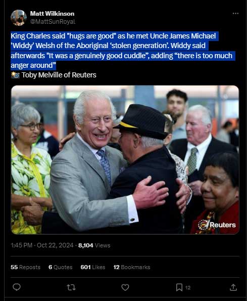 Charles heartwarming gesture went viral as he said "hugs are good" as he met Uncle James Michael 'Widdy' Welsh. Widdy said afterwards "It was a genuinely good cuddle”, adding “there is too much anger around.”