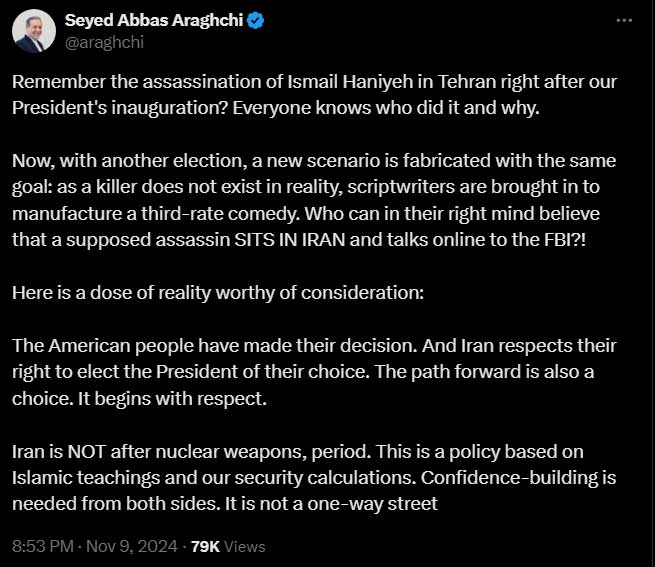 "Now ... a new scenario is fabricated ... as a killer does not exist in reality, scriptwriters are brought in to manufacture a third-rate comedy," Araqchi said in a post on X.