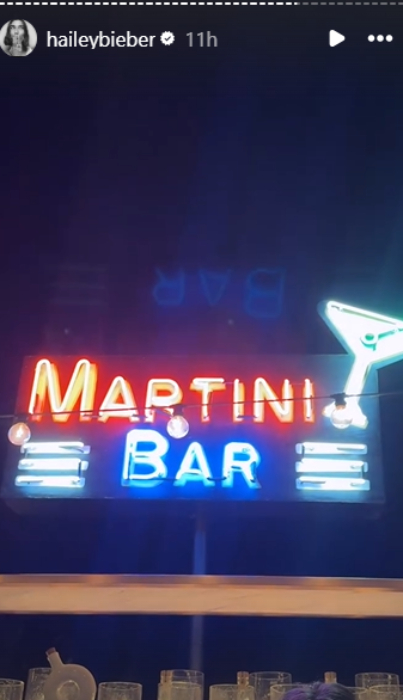 Bieber’s first post showed a blue and red neon “Martini Bar” sign above the drinks shelf at the party.