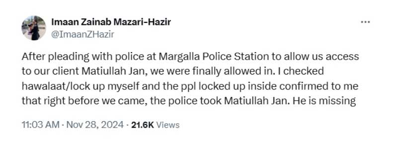 "After pleading with police at Margalla Police Station to allow us access to our client Matiullah Jan, we were finally allowed in. I checked hawalaat/lock up myself and the ppl [people] locked up inside confirmed to me that right before we came, the police took Matiullah Jan. He is missing," Mazari wrote on her official X handle, formerly Twitter.