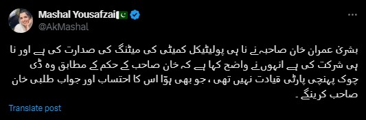Taking to X, formerly Twitter, Mashal Yousafzai said: "She [Bushra] reached the D-Chowk as per Khan's directions [whereas] party leadership wasn't there".