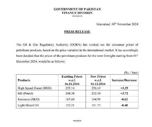 The federal government on Saturday announced a Rs3.72 per litre increase in the price of petrol for the next fortnight, starting from December 1.