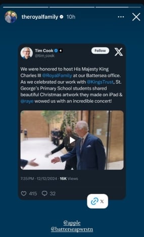 Tim shared video glimpses of the King's visit on X and wrote, "We were honoured to host His Majesty King Charles III @RoyalFamily at our Battersea office."