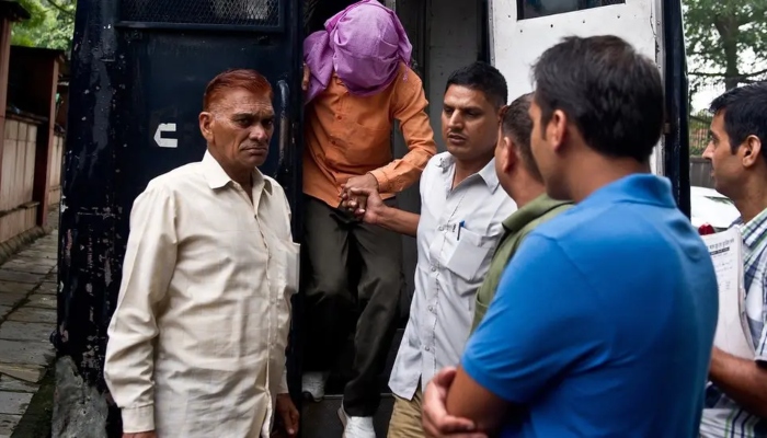 Roy was brought to court by a prison van and greeted by a crowd of protesters, held at bay by police officers, demanding he be given the death penalty.