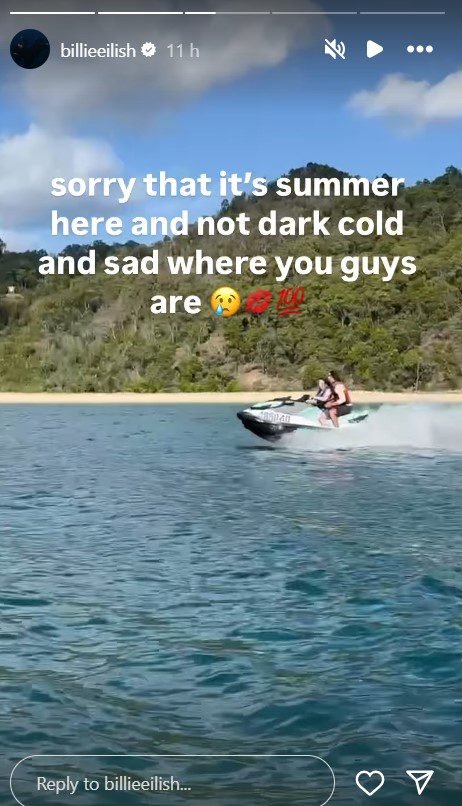 While jet-skiing in a scenic unknown location, the Ocean Eyes hitmaker shared a thrilling video, captioning it, “Sorry that it’s summer here and not dark cold and sad where you guys are.”