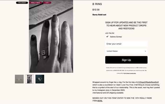 For the first giveaway, Gomez, 32, listed the Jacquie Aiche diamond “B” ring she once used to confirm her relationship with the 37-year-old music producer — for just $12.