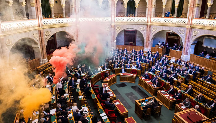 Opposition politicians from the liberal Momentum disrupted the vote by shouting, lighting flares and playing the old Soviet Union anthem.