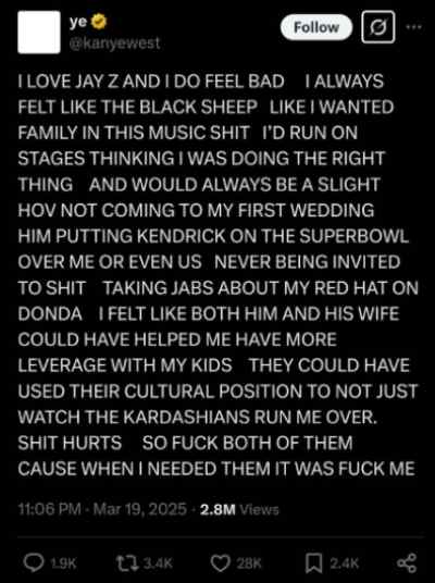 “I LOVE JAY Z AND I DO FEEL BAD,” the rapper wrote on X Wednesday, March 19, referring to his post the previous night. “I ALWAYS FELT LIKE THE BLACK SHEEP LIKE I WANTED FAMILY IN THIS MUSIC S**T,” he added.