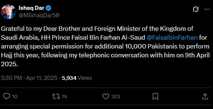 Taking to his X handle, DPM Dar expressed gratitude to the kingdom’s Foreign Minister Prince Faisal Bin Farhan Al-Saud for granting the additional Hajj quota.