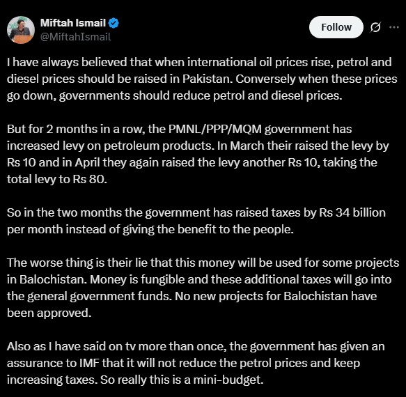 Miftah Ismail, former finance minister, has lambasted Prime Minister Shehbaz Sharif's government for practically introducing a "mini-budget under the garb of development projects for Balochistan" via its decision to deny the masses relief in petroleum prices.