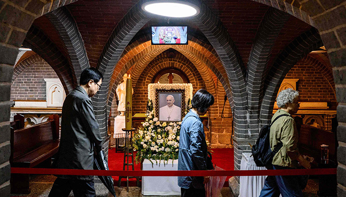 The Vatican on Tuesday released photographs of Francis dressed in his vestments and laid in a wooden coffin in the chapel of the Santa Marta residence, where he lived during his 12-year papacy. Swiss Guards stand on either side of the casket.