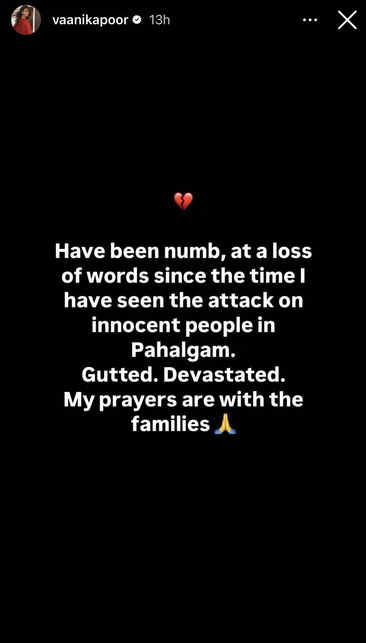 Kapoor, also taking to Instagram, wrote: “Have been numb, at a loss of words since the time I have seen the attack on innocent people in Pahalgam. Gutted. Devastated. My prayers are with the families.”