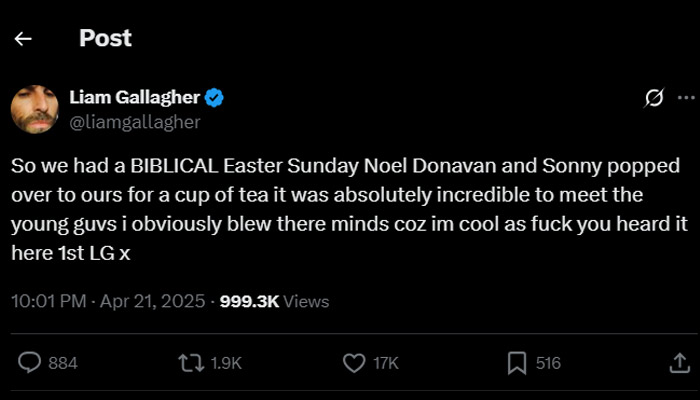 "So we had a BIBLICAL Easter Sunday Noel Donavan and Sonny popped over to ours for a cup of tea it was absolutely incredible to meet the young guvs [sic]," he wrote in the post. "i obviously blew there [sic] minds coz im cool as f*** you heard it here 1st LG x."