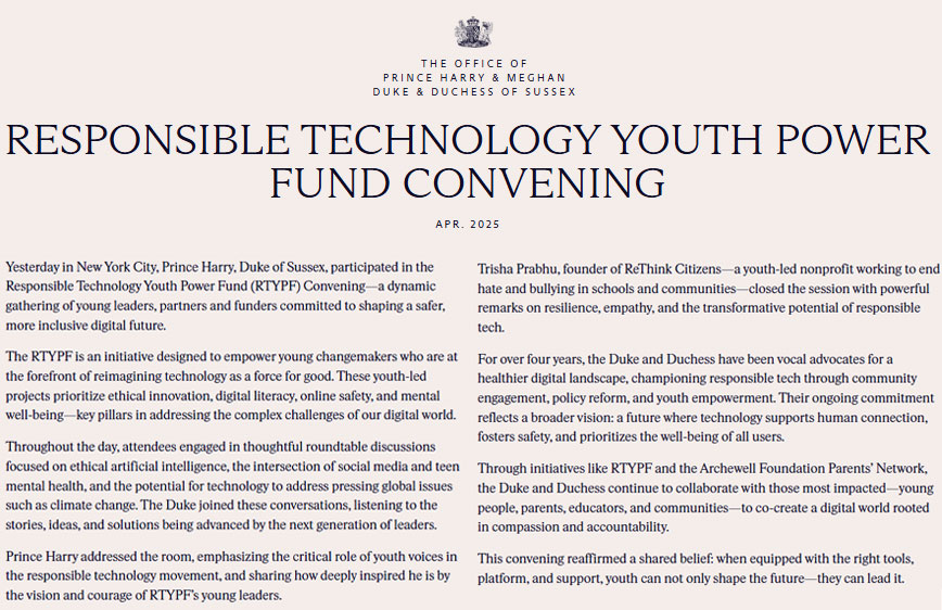 King Charles’ youngest son addressed the room, emphasising “the critical role of youth voices in the responsible technology movement, and sharing how deeply inspired he is by the vision and courage of RTYPF’s young leaders.”