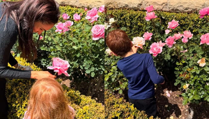 In the first photo, Meghan herself appears, holding a pink rose under the sunny sky with her children nearby.