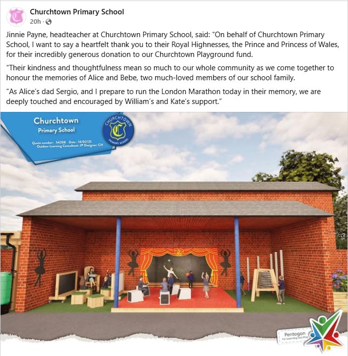 “On behalf of Churchtown Primary School, I want to say a heartfelt thank you to their Royal Highnesses, the Prince and Princess of Wales, for their incredibly generous donation to our Churchtown Playground fund,” the message read.