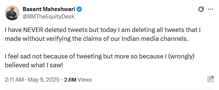 The fabricated reports were so excessive and absurd that they sparked backlash from within India itself. Notably, Indian commentator and author Basant Maheshwari publicly apologised for sharing unverified news: