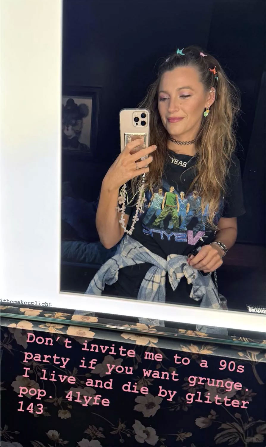 Sharing her look for the night, the Another Simple Favor star wrote, "Don’t invite me to a ’90s party if you want grunge. I live and die by glitter pop," on her Stories alongside a mirror selfie.
