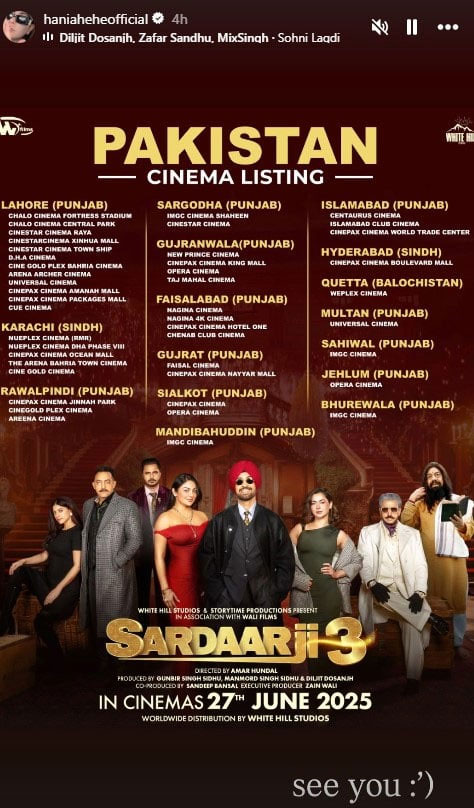 Hania Aamir's Sardaar Ji 3 to release in Pakistani cinemas tomorrow