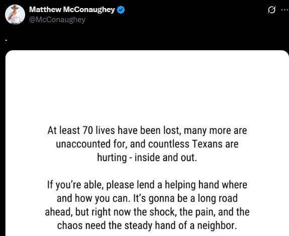 Matthew McConaughey has recently extended words of kindness after the devastating floods that killed dozens in Texas.