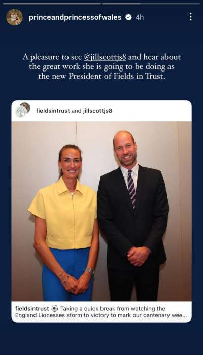 On his trip to Switzerland to watch England’s women’s football team face off in the Euros on July 9, the Prince of Wales met with former footballer Jill Scott and formally welcomed her as the new President of Fields in Trust, according to an Instagram post shared by William himself.