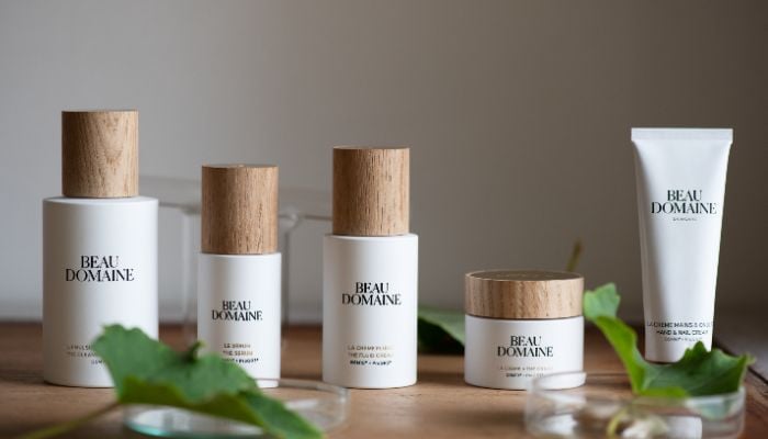 The original skincare packing consisted of dark glass bottles and wooden tops made from Château de Beaucastel, embellished with finger-shaped divets.