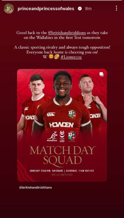 “Good luck to @britishandirishlions as they take on the Wallabies in the first Test tomorrow,” he wrote in the July 18 Instagram Stories post.