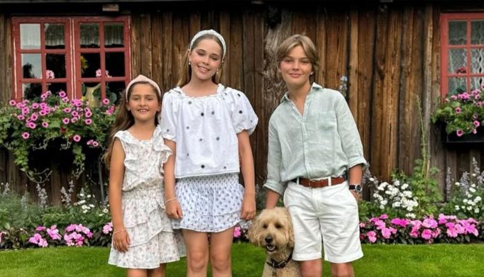 Posted to Instagram, the picture shows Princess Leonore, 11, Prince Nicolas, 10, and Princess Adrienne, 7, posing happily in front of what appears to be a summer house, joined by the family’s adorable dog, Teddy.