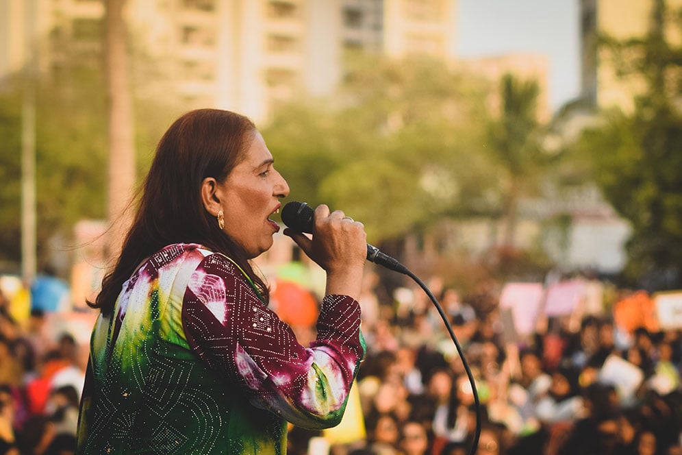 Sheema Kirmani talking to the press regarding the march. Photos by the author.Sheema Kirmani on stage at the 2nd Aurat march at Frere Hall in Karachi. Photos by the author.
