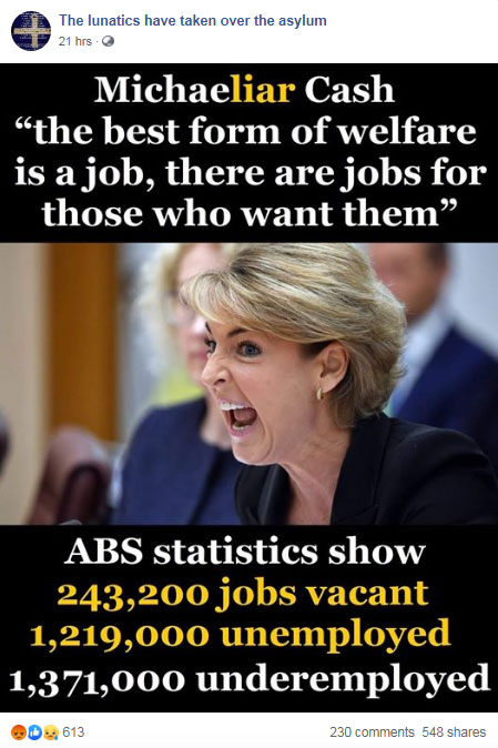 This Facebook post, published on a page called ‘The lunatics have taken over the asylum’ on August 6, 2019, features a photo of Australian senator Michaelia Cash alongside the misleading statistics. It has been shared more than 800 times.