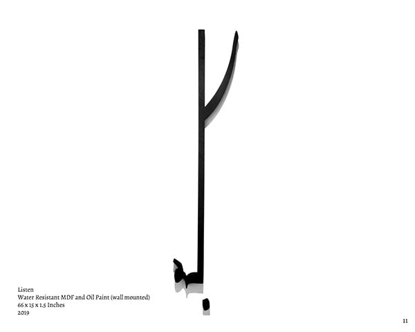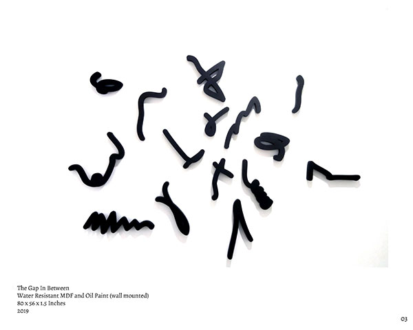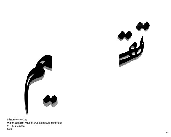Titled ‘Misunderstandings’ Muzzumil Ruheel’s works in water resistant MDF and oil paint were displayed in a solo exhibition, in mostly wall hangings at Canvas Gallery, Karachi. Done in black colour against light background the lines he had chosen to represent words fully interpret his interactions with misunderstood words.