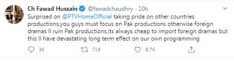 Taking to Twitter on Sunday, the minister urged the state-run TV to focus on local productions because foreign dramas can ruin Pakistani productions.