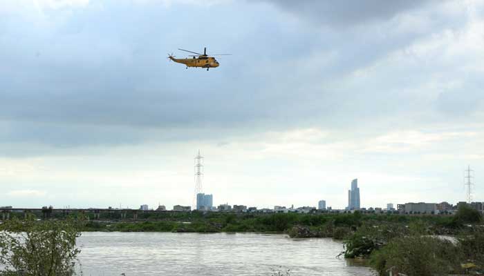 “Pakistan Navy Seaking helicopter conducted aerial reccee of Korangi crossing, Quaidabad (Malir nadi), and Goth Shafi Muhammad while aerial reccee with the help of a quadcopter was also carried out in Saddar Town in support of relief operations to localize individuals requiring assistance. Additionally, ration bags and cooked meal was also dropped at various areas,” said the statement.