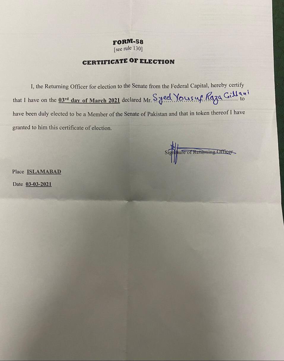 Gilani's certificate of election for the Senate seat has also been duly issued by the ECP.
