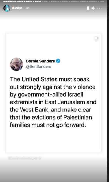 The British , who won the coveted British Album of the Year prize at the Brit Awards on Tuesday, took to her Instagram stories to share a tweet from US Senator Bernie Sanders who faulted the actions of Israeli right-wing extremists for sending tensions spiraling and sparking another conflict between Israel and Palestine.