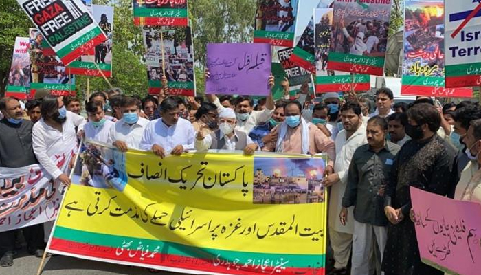During a PTI-organised protest in Lahore, party leader Ijaz Chaudhry said innocent Palestinian children were dying due to Israel's attacks and demanded the Muslim world adopt a joint strategy against Israel.