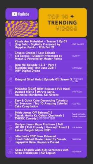 In 2021, YouTube Pakistan witnessed various videos that trended at the top in the country, dominated by the drama industry of Pakistan. This year Pakistani drama Khuda aur Mohabbat, took the number one spot on the Top Trending Videos list.