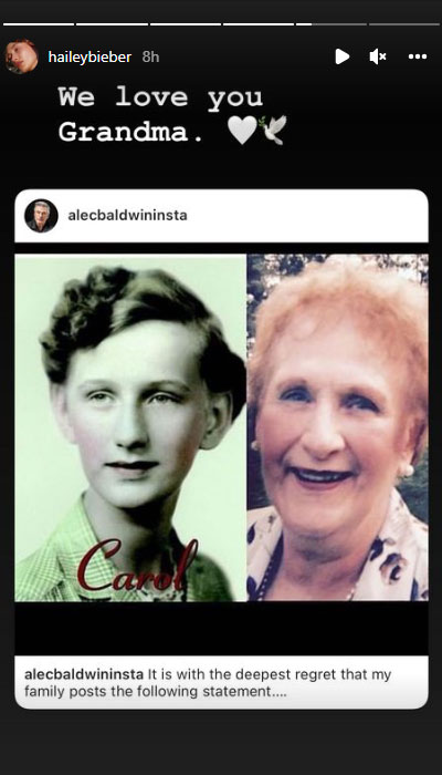 The 25-year-old also paid homage in her stories to her beloved grandmother after her uncle and Carol’s son and actor Alec Baldwin announced her death.