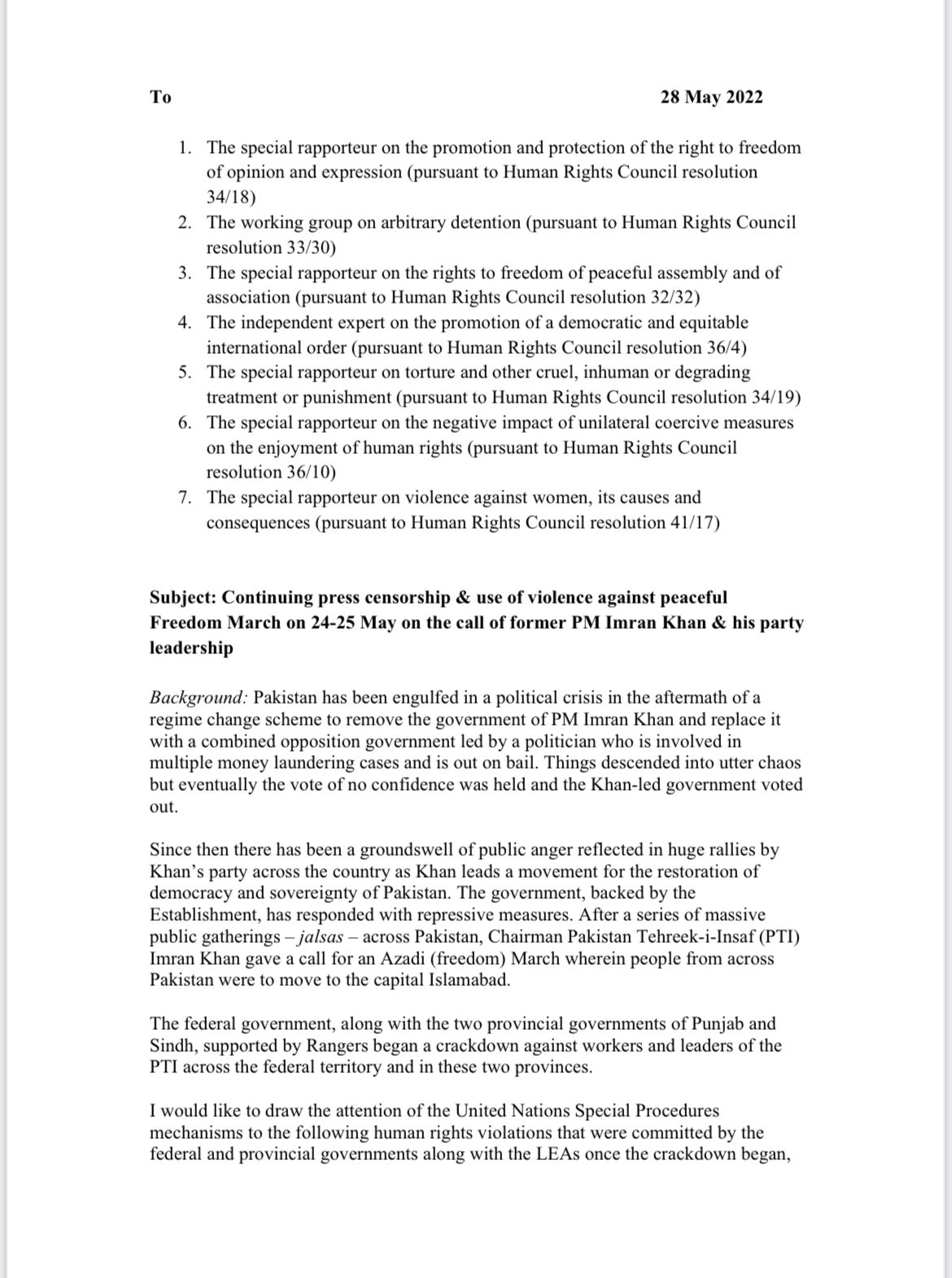 The UN was also told that the and federal government began a crackdown against the PTI workers and leaders in Sindh and Punjab that were "supported by rangers".