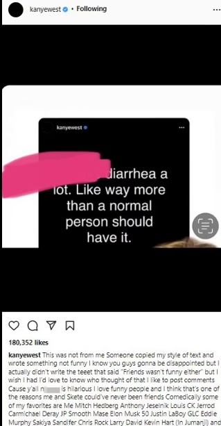 On Sunday 'Ye shut down a meme that read 'Kim has diarrhea a lot. Like way more than a normal person should have it,' covering his ex-wife's name with a thick pink smudge.