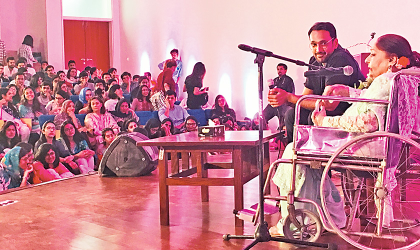 “No introduction can do her justice,” is what Bilal Tanweer, the host, an author and faculty member at LUMS said about Farida Khanum at her Maestros of Raag night. Instead an interview clip from the famed singer’s heyday, a 1974 interview with Zia Mohyuddin, was played where she sang and as that screen was lifted, she was brought out on a wheelchair.