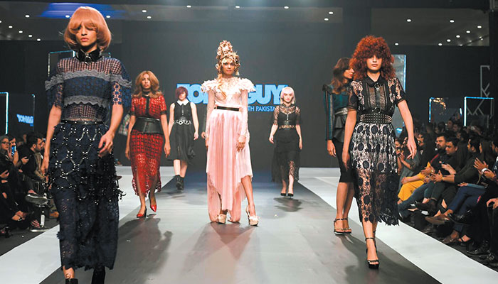 The hair, of course, was the highlight of the show. Each style a head turner, the catwalk opened to looks controlled by trending cuts and colours, ranging from auburns to ashes. This was hair that belonged essentially to the club culture but it added a fifth dimension to the wardrobe, flown down from London, giving it a life of its own. One looked at each style and wondered, would women in Pakistan dare to step into such adventurous territory? Yes and no, depending on the particular style, but fashion would look a lot more exciting if they did.
