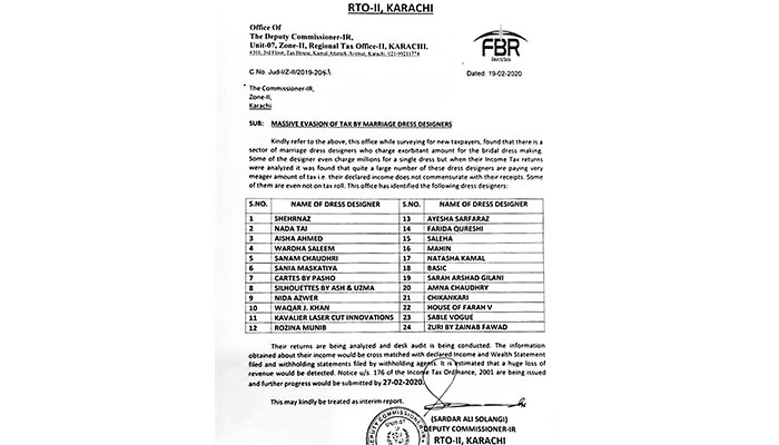 Read the FBR notice: “Some of the designers even charge millions for a single dress but when their Income Tax returns were analysed it was found that quite a large number of these dress designers are paying very meager amount of tax i.e. their declared income does not commensurate their receipts.”