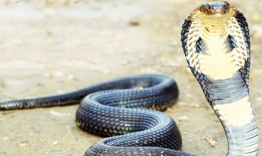 The king cobra - one of the most venomous snakes on the planet - can reach 18 feet in length, making them the longest of all venomous snakes. The amount of neurotoxin cobras can deliver in a single bite - up to two-tenths of a fluid ounce - is enough to kill 20 people, or even an elephant. King cobra venom affects the respiratory centers in the brain, causing respiratory arrest and cardiac failure.