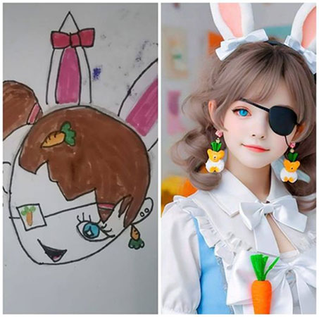 A friend used the following prompt on Meta AI to recreate a drawing, named Doda, that she made a while ago: “A girl with bunny ears, one ear has a bow that is red, and her hair is brown. She is wearing a carrot pin, earrings, and an eye patch; she has blue eyes.”