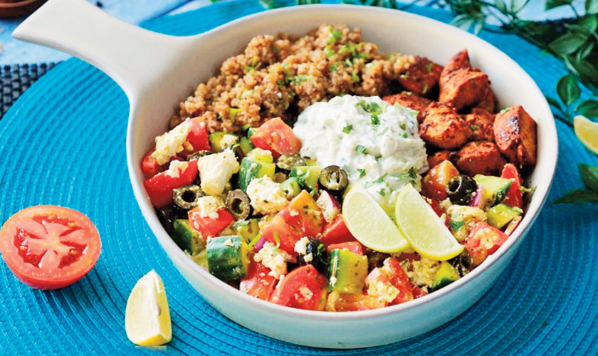 * On a serving dish, add quinoa, Greek salad, prepared chicken and tzatziki sauce.