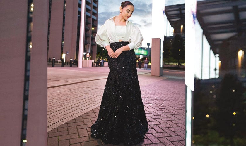 Yumna Zaidi in a Nomi Ansari black mermaid skirt and white cropped top brings all the drama. It’s perfect for a red-carpet event or a fancy soiree. Style it with sleek hair, bold earrings, and a red lip to really play up the contrast.