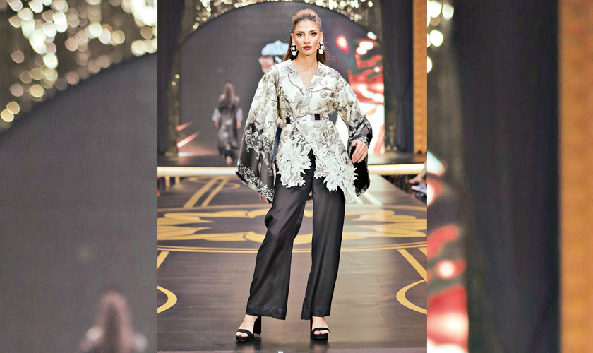 In ‘Darker Shades of Hunza,’ Fahad Hussayn drew inspiration from highland beauty, integrating embroidery and map motifs that symbolised the essence of Hunza. His collection melded traditional aesthetics with contemporary street style, celebrating nature’s raw beauty and Pakistani pride while delivering an elegant look.