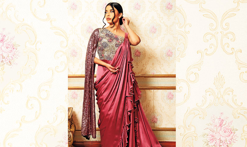 This silk saree is pure elegance, featuring intricate floral embroidery on a pearl-studded blouse with an asymmetrical cut. The long, flowing sequin sleeve cascades beautifully from the elbows adds a touch of glam. The saree is draped in a unique, contemporary style, making it the ultimate Valima showstopper.