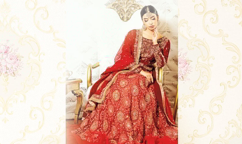 This deep maroon lehenga choli is adorned with intricate zari work, resham detailing, and just the right amount of sequins for that extra sparkle. The lehenga flows into a mermaid-style silhouette with playful organza ruffles at the hem. Paired with a delicate net dupatta finished with kiran borders, this outfit is perfect to command the Barat spotlight.